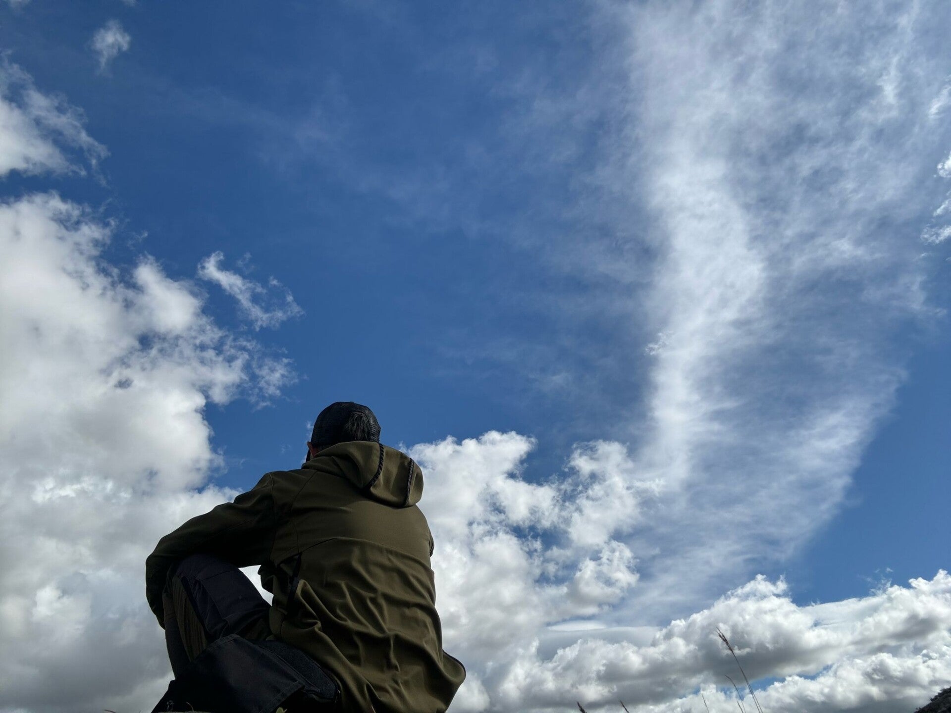 Man sitzt still da, den Blick fest auf die tanzenden Flammen gerichtet.
